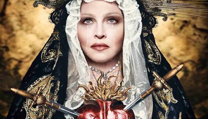 The 64-year-old singer wore a headpiece from Dolce & Gabbana and was photographed against the backdrop of the image of a heart pierced by seven daggers, which resembles the icon of the "Seven-shot" Virgin.