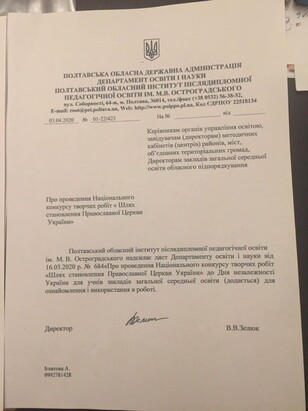 "Another example of this is the activity of the Department of Education and Science of the Poltava Regional State Administration, which is actively promoting the project of the public organization ‘Institute of Political, Legal and Religious Studies’ to hold a competition of creative works ‘The path of formation of the Orthodox Church of Ukraine’ on the Independence Day of Ukraine," the hierarch explained. “With the support of the administrative resource, in particular, heads of educational administrative bodies, heads of methodological offices of districts, cities, united territorial communities, and directors of general secondary education institutions of regional subordination are involved to ensure the implementation of this event.”