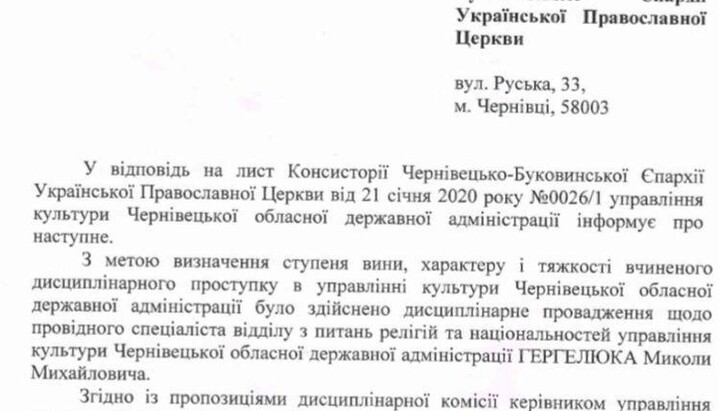 "In order to determine the degree of guilt, nature, and gravity of the disciplinary offense, the Department of Culture of the Chernivtsi Regional State Administration initiated disciplinary proceedings against the leading specialist of the Department for Religions and Nationalities of the Directorate for Culture of the Chernivtsi Regional State Administration, Nikolai M. Gergeliuk," says the answer of the head of the Directorate for Culture of the Chernivtsi RSA.