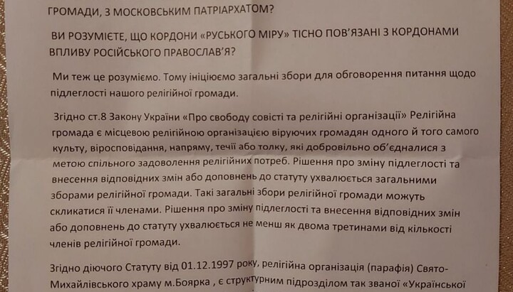 Matushka Tetiana said that provocative billboards and leaflets began to appear in the town on the eve of the meeting. They urged locals to come to the meeting and vote against the "Russian world" and the "influence of Russian Orthodoxy" on Boyarka's united territorial community.