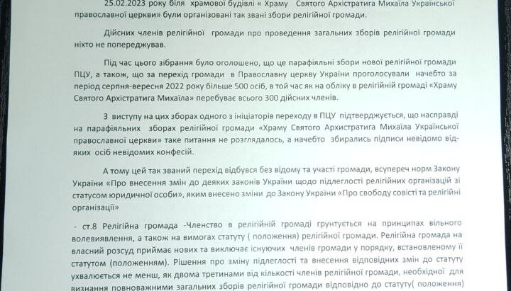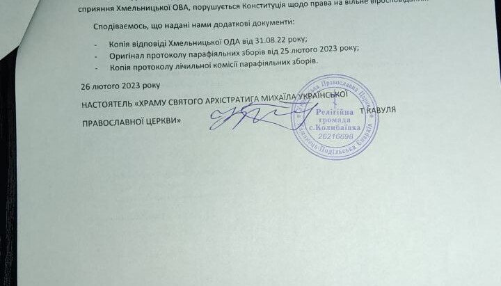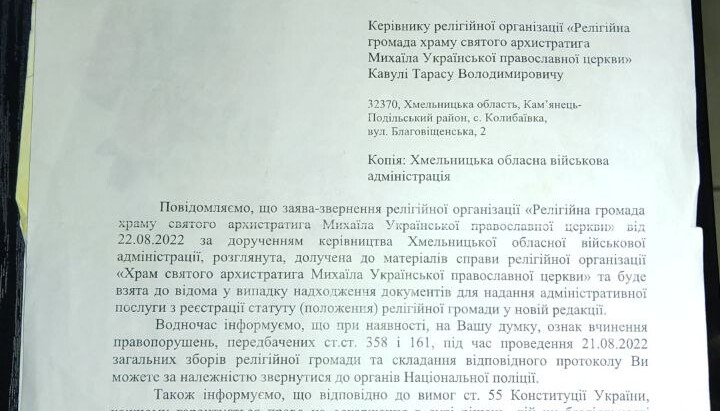 “On August 22, I filed a letter of appeal to the governor of the Khmelnytsky region explaining the situation and reminding that our parishioners stood their ground, recalled the results of our community’s vote, spoke briefly about how the meeting of the OCU was held, where it was held, with what violations,” Father Tarasy says. “<…> At the end of this cover letter, I noted that our community did not authorize anyone and did not delegate such authority to anyone to change the name of the religious community, change jurisdiction, change the leader.”