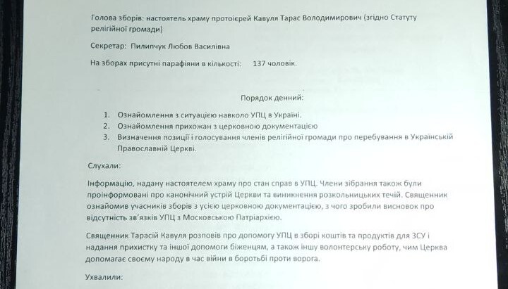 At the same time, 2 months later, in August 2022, OCU supporters held their meeting in the village club. At the meeting, people who have nothing to do with the community and church life voted allegedly for the transfer of the temple to the OCU.