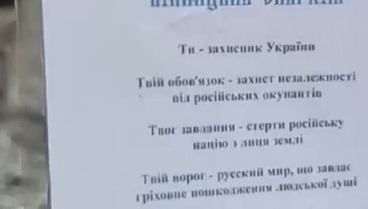 "You are a defender of Ukraine. Your duty is to defend the independence from the Russian occupiers. Your task is to wipe the Russian nation off the face of the earth. Your enemy is the Russian world, which damages the human soul. Killing Russians is not a sin," the leaflet says.