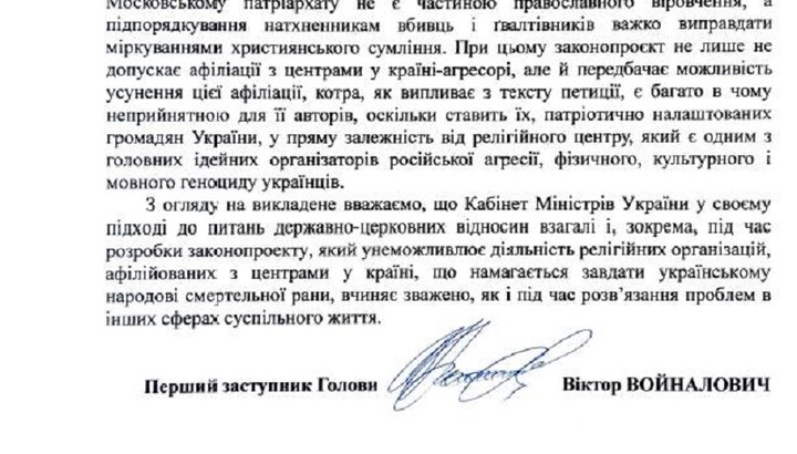 “Let the Secretariat of the Cabinet of Ministers of Ukraine find out where I am filing a complaint regarding why dear Mr. Viktor Voynalovych, who signed the answer to the petition of 25,000 citizens, assumed the functions of the Prime Minister of Ukraine. Anyway, it is obvious that this document is just a reply and evidence that the tools of democracy proposed by the state to address acute social problems do not work. This means that on the basis of value judgments and biased vision, the government will take repressive measures against its own citizens, limiting their constitutional right to freedom of religion,” summed up Yulia Kominko.