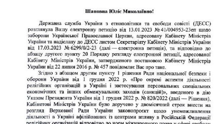 Journalist Yulia Kominko published on her Facebook page a letter from the State Ethnopolitics regarding a petition against the ban on the UOC.