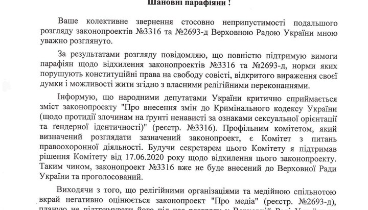 With the blessing of Metropolitan Luke (Kovalenko) of Zaporozhye and Melitopol, all the churches of the eparchy organized the collection of signatures of parishioners to an appeal to the VR Speaker Dmitry Razumkov. The appeal speaks of the inadmissibility of adopting these bills in their current form without revisions.