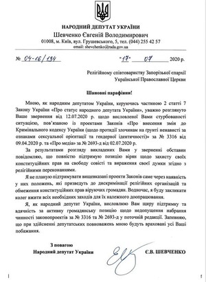 Deputies of the Verkhovna Rada of Ukraine Еugeny Shevchenko and Sergei Minko promised full support to the believers of the Zaporozhye Eparchy of the UOC, who initiated the collection of signatures against the bills "On Media" (No. 2693-d) and "On Amendments to the Criminal Code of Ukraine (regarding counteracting hate crimes based on sexual orientation and gender identity)”(No. 3316), as reported on the eparchy’s website.