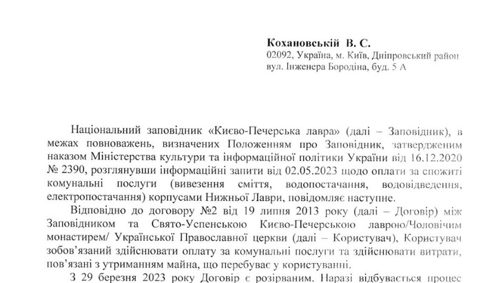 Acting head of the Kyiv-Pechersk Lavra Reserve Maksym Ostapenko wrote in a letter addressed to lawyer Viktoria Kokhanovska that despite the fact that the agreement between the Reserve and the UOC has been terminated, the UOC must pay communal charges in the Kyiv-Pechersk Lavra.