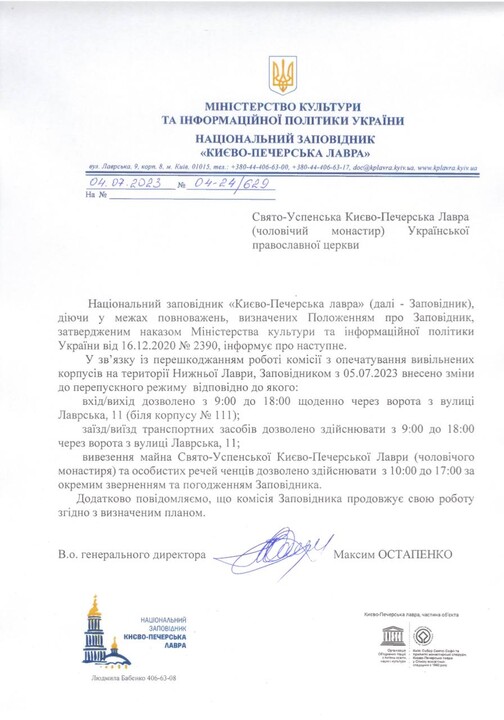 The document says that it will be possible to take out property and personal belongings from the territory of the Lavra only from 10:00 to 17:00 upon a separate request and agreement of the Reserve.