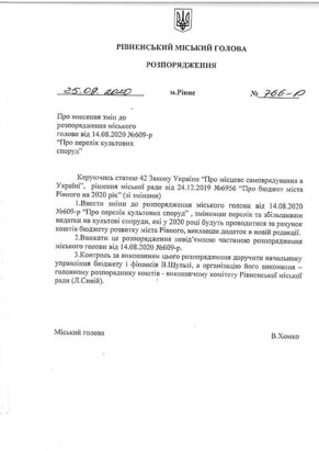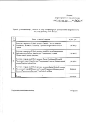 Rivne Mayor Vladimir Khomko issued an order according to which the UGCC and OCU will receive UAH 500,000 from the city budget. The document was published on the website of the Rivne City Council.