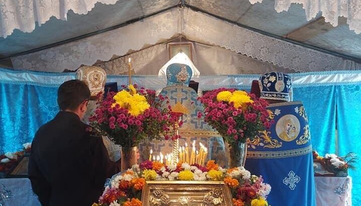 The festive service was performed in a tent set up near the church, unlawfully seized by supporters of the OCU.