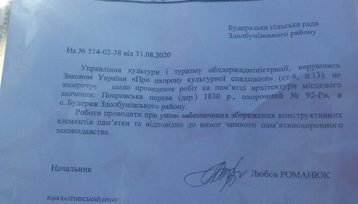 Recently, the Department of Culture in the Rivne region gave official permission for the restoration of the Holy Protection church in the village of Buderazh, but not to the OCU community, but to the Buderazh village council.