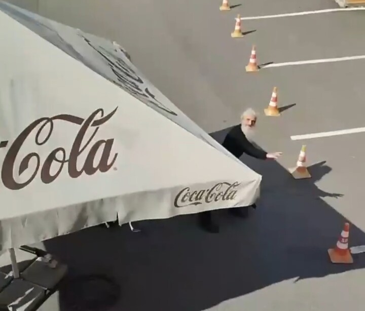 In the video, a woman approaches the sealed building to pass the bread to the people inside, and a policeman tells her, "Don't cause trouble." She responds, "I'm not causing trouble," and steps back from him.