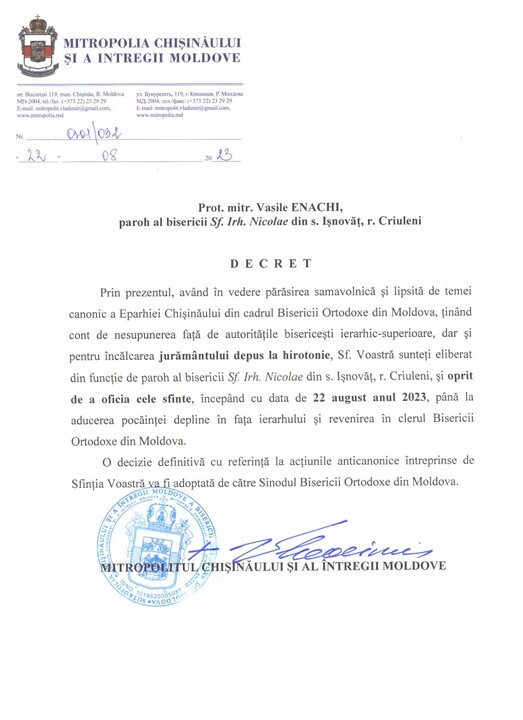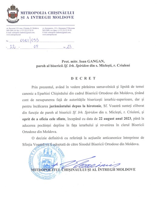 The priests were relieved of the rectorship in the churches where they had served before and deprived of their right to perform divine services "until they fully repent to the hierarchy and return to the clergy of the Orthodox Church of Moldova".