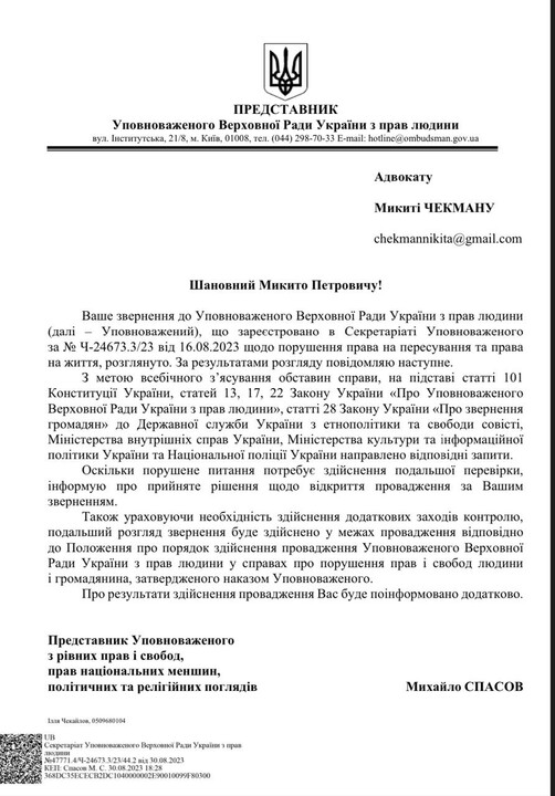 On September 1, 2023, the representative of the Ukrainian Parliament's Commissioner for Human Rights, Mykhailo Spasov, initiated an investigation into a series of severe violations of the rights of monks and believers of the UOC by the staff of the Kyiv-Pechersk Lavra Reserve, as reported by the lawyer of the Lavra, Father Nikita Chekman, on his Telegram channel. He stated that an inquiry has been launched into this matter and published a letter from Spasov.