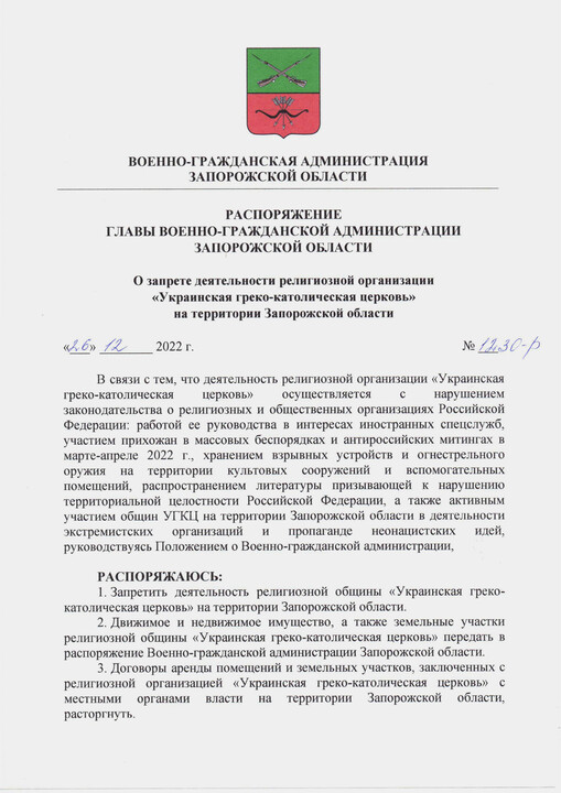 In addition to banning the denomination, the "authorities" of the Zaporizhzhia Region ordered to confiscate the property of the UGCC, to break all lease agreements with it, not to register UGCC communities and to prohibit those who held leadership and administrative positions in the UGCC from registering public and religious organisations.
