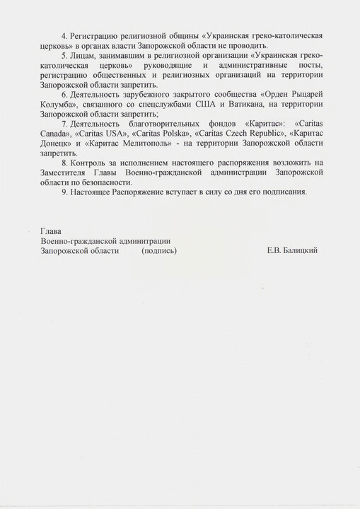 The Ukrainian Greek Catholic Church said that a year ago the Zaporizhzhia Region “authorities” banned the activities of their denomination in the region. The corresponding order of the "governor" of the region, Evgeny Balitsky, dated 26 December 2022 was published on the website of the UGCC.