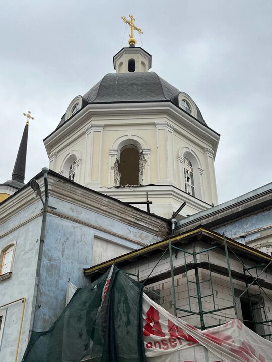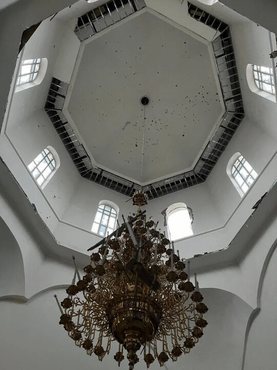 The Assumption Cathedral had the dome damaged. The floor of the temple is strewn with broken bricks and glass shards. The dome itself is cut with shrapnel. Some icons were broken.