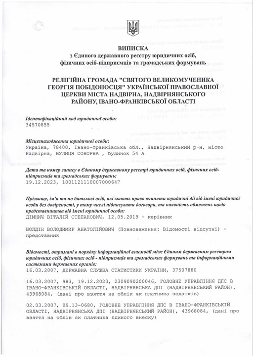 On 23 December 2023, the mayor of the town of Nadvirna, Lviv region, Zinoviy Andriyovych announced on Facebook the liquidation of the only UOC community in the town – St. George's.