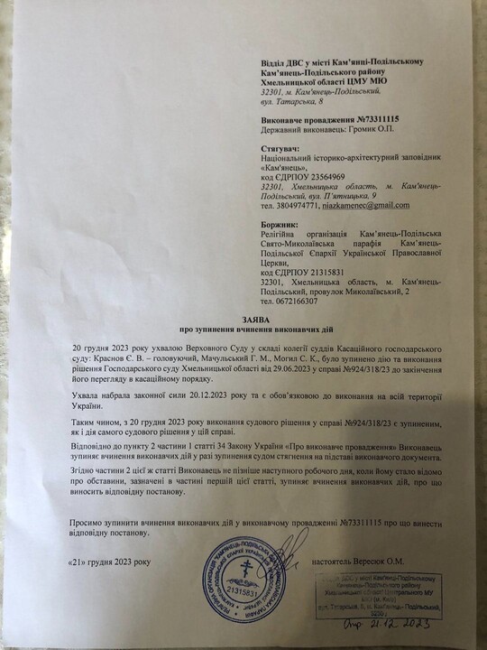 On 20 December 2023, the Supreme Court of Ukraine cancelled the decision of the Economic Court of Khmelnytsky region of 29 June 2023 to evict the St. Nicholas community of the UOC in Kamyanets-Podilskyi from the St. Nicholas Church and transfer the church to the local Reserve "Kamyanets". The corresponding document was published by the church community on Facebook.