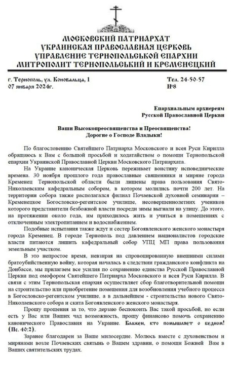 The Ternopil Eparchy said the "letter" of Metropolitan Sergiy to ROC hierarchs about raising funds for the needs of the eparchy published on the web was a fake.