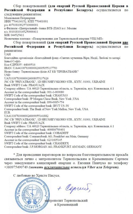 It was noted that "Metropolitan Sergiy did not give any blessing for any fundraising indicated in the provocative letter, nor was any letter sent with this text".
