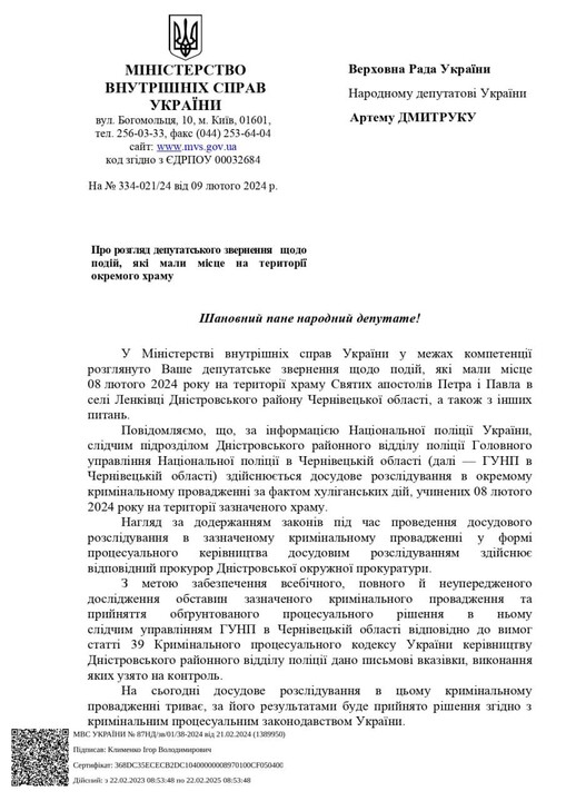 Member of Parliament Artem Dmytruk reported that he had received a response from the Minister of Internal Affairs to his parliamentary inquiry regarding the attempted seizure of the temple and assault on members of the Sts. peter and Paul community in Lenkivtsi, as stated by the MP in his Telegram channel.
