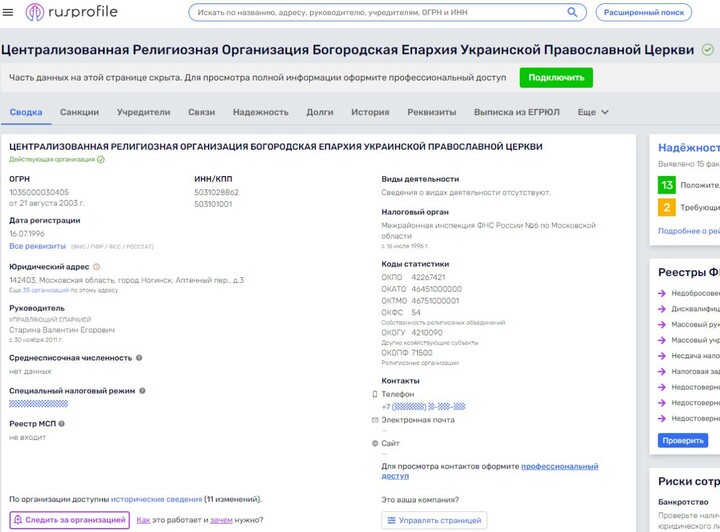 The resource published a screenshot of the RF service for the verification and analysis of Russian legal entities and entrepreneurs Rusprofile. On the portal, the Dumenko structure is listed as "Centralised religious organisation Bogorodsk Eparchy of the Ukrainian Orthodox Church".