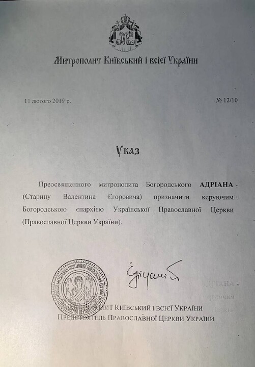 The channel also published the decree of Epifaniy Dumenko on the appointment of Starina as the head of the Bogorodsk Eparchy of the OCU.