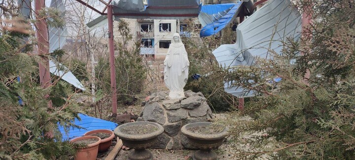 The footage shows that the church has been completely destroyed by shells. The roof with the attached dome has collapsed, ceiling slabs have fallen and collapsed, and a large part of the walls has crumbled. Miraculously, the sculpture of the Virgin Mary next to the church has survived.