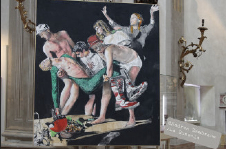 Another painting refers to Caravaggio's depiction of the Deposition of Christ from the Cross. In Saltini's interpretation, it appears as gay propaganda: a man held by several naked and semi-naked people, wearing a tight gay pride bodysuit and with hair dyed white.