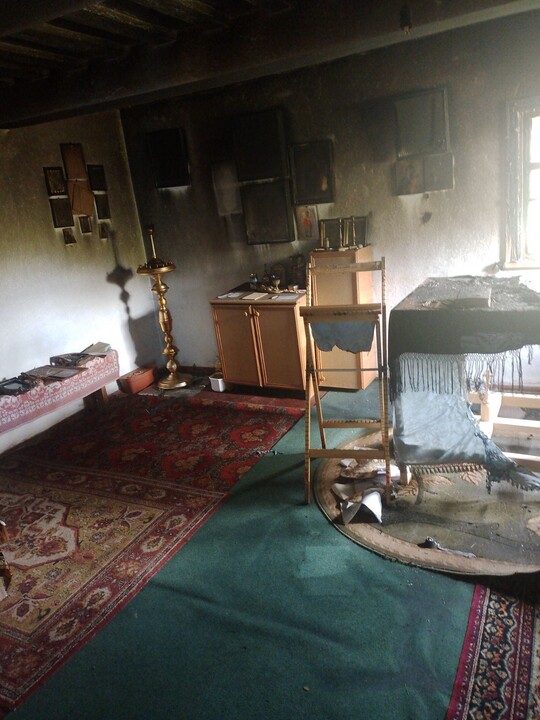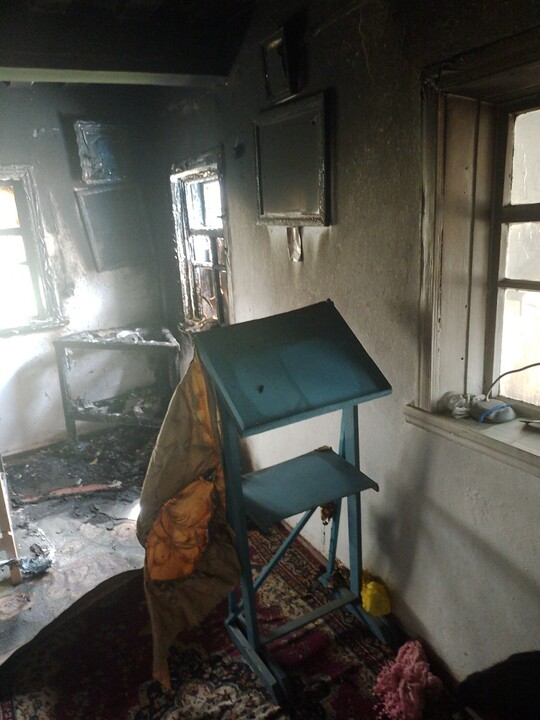 As a result of the arson, the walls, the temporary communion table, and sacrificial altar in the prayer house were burned down.
