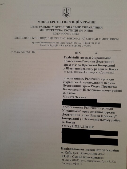 The Tithe Monastery received a letter from the state executor stating that bulldozers would be brought to the temple on May 7, Tuesday of Bright Week, to demolish the sanctuary. The document was published by the Dozor_kozak1 Telegram channel.