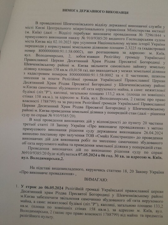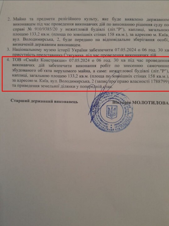 As the UOJ wrote, according to current legislation, customers do not have the right to demolish the temple; this should be done by the religious community of the Tithe Monastery by court order. However, a contract was concluded between the museum, the charitable foundation, and the LLC "Smile Construction", under which the museum hires the foundation as a subcontractor that orders the demolition of the monastery from LLC "Smile Construction". According to the contract, the subcontractor undertook to destroy the temple within 10 days from the moment of adopting the "Resolution on Involving the Economic Entity in Enforcement Actions", signed on April 26, 2024.