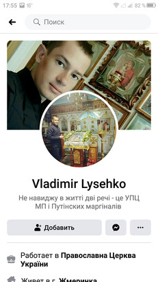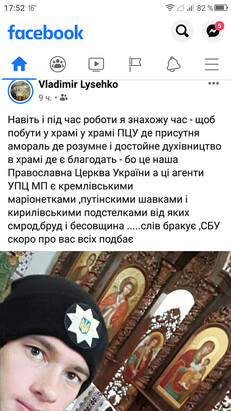 He said that the user Vladimir Lysenko was added to his friends, who in publications with access only for friends writes threats to the UOC with the words: "Oh, I'll tackle you, a Moscow bitch ... once there is the right time." Lysehko indicated OCU as his place of employment, but on May 19 he published a photo in the uniform of an employee of the National Police of Ukraine and wrote that during the service he finds time to “spend in an OCU temple”, as well as writes insults toward the UOC with the words: “SBU is going to ‘take care’ of all of you soon."
