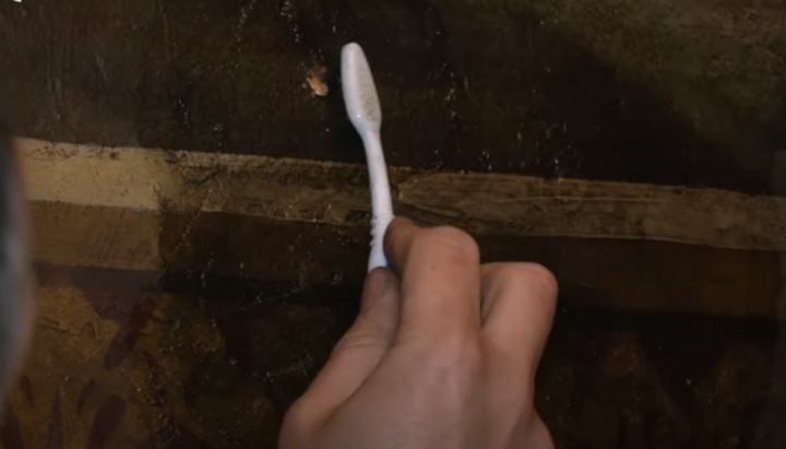 "Restorer" brushes paint off an ancient mural in the Transfiguration Cathedral in Chernihiv. Photo: screenshot from the Suspilne Chernigiv YouTube channel