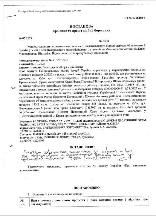 In a resolution published online describing the property of the demolished Tithe (Desiatynny) Monastery church of the UOC, officials have imposed an arrest on the liturgical items. According to the Dozor_koxak1 Telegram channel, on May 25, 2024, the officials seized the liturgical items.