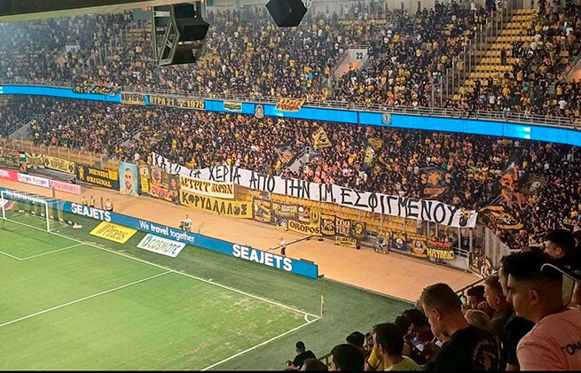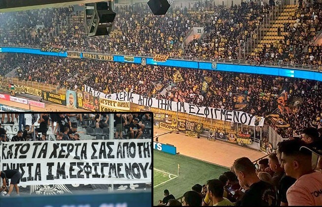 Fans of AEK Athens at the "Opap Arena" during a Conference League qualification match and fans of PAOK showed their support for the Esphigmenou Monastery.