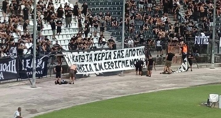 The fans put up a banner reading "Hands off the true Holy Monastery of Esphigmenou," aiming to show their support for the monastery.