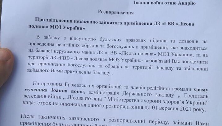 According to the priest, the hospital administration demanded that the UOC community vacate the chapel on June 1, but after the priest wrote a letter to the chief physician, they gave a delay until September 1.