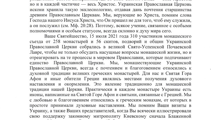 Your Holiness, on July 15, 2021, 310 participants of the monastic congress from 258 monasteries and 56 sketes, households and communities of the Ukrainian Orthodox Church gathered at the great Holy Dormition Pochaiv Lavra in order not only to discuss the pressing issues of monastic life but also to respond to those processes in world Orthodoxy, which undermine the unity of the Orthodox Church. We, monastics of the Ukrainian Orthodox Church, have always treated the spiritual tradition of the great Greek monasteries with respect and reverence. For us, both Holy Mount Athos and other monasteries in Greece have been places of receiving spiritual guidance and care. This phenomenon is traditional for the monastic tradition of our Church. Almost every monastery in Ukraine has icons painted on Mount Athos and Greece-related shrines. We treated the Greek monks, from whom we received spiritual instruction in simplicity, with love and reverence. We remember your visits to Ukraine, as well as your representatives’, when you illustrated in every possible way your support for the legitimate Metropolitan of Kyiv, first to His Beatitude Metropolitan Vladimir (Sabodan), and then to his successor, Metropolitan Onuphty of Kyiv and All Ukraine. Therefore, for us the greatest pain and the greatest sorrow were those treacherous actions that you, as a first among equal bishops of the Orthodox world, made towards the canonical Ukrainian Orthodox Church. We are at a loss as to what motivated your decisions, but we see with our own eyes what they led to. With confusion in our hearts and sorrow, we, monastics of the Ukrainian Orthodox Church, ask you, Patriarch Bartholomew, how your morality accepts the level of turmoil that your decision brought to our country: the seizure of churches, the beating of ordinary believers, discrimination of our pastors and flock at the state level, calls for the extermination of our clergy? Do you understand that in your declining years, you became the reason for the division of the one people of God, in which, according to the words of the Apostle Paul: “Here there is no Gentile or Jew, circumcised or uncircumcised, barbarian, Scythian, slave or free, but Christ is all, and is in all” (Col. 3:11)? To please what anti-church forces, you committed an unprecedented crime against the Church? Do you realize that into the bloody confrontation that sows grief among our people, you brought new seeds of religious struggle, from which the Lord saved us earlier?