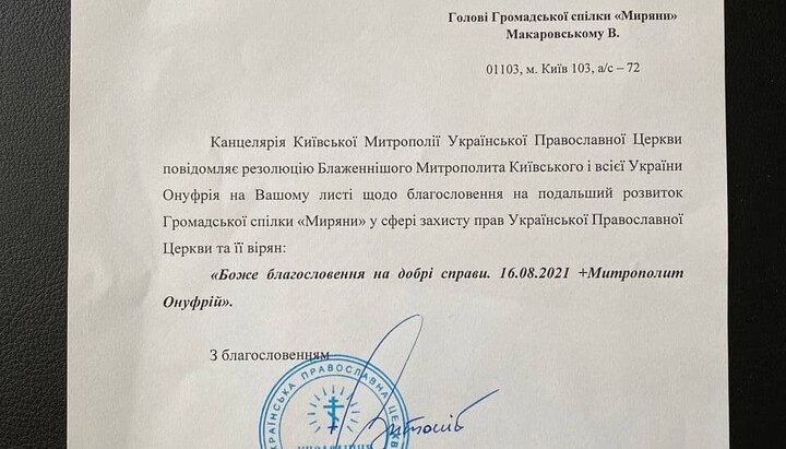 “With reference to your letter regarding the blessing for the further development of the Public Union ‘Miriane’ in the field of protecting the rights of the Ukrainian Orthodox Church and its believers, the Office of the Kyiv Metropolitanate of the Ukrainian Orthodox Church notifies of the Resolution of His Beatitude Metropolitan Onuphry of Kyiv and All Ukraine :