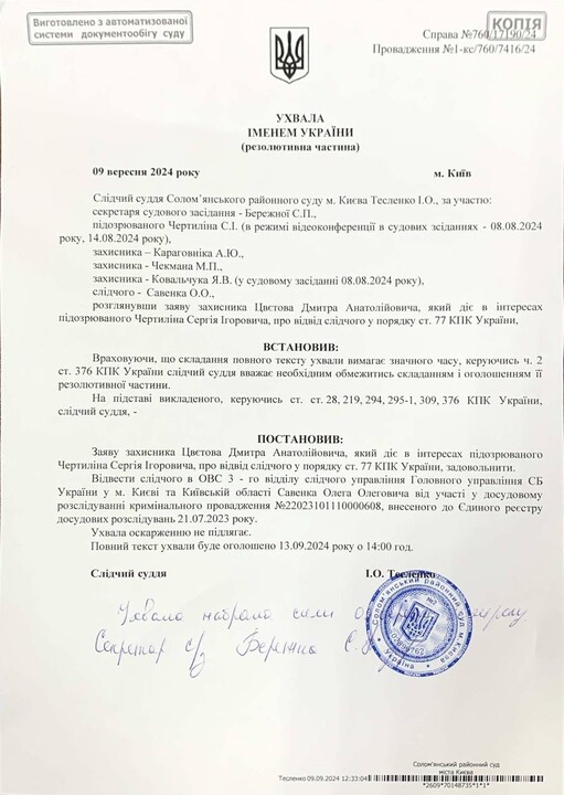 On September 9, 2024 the judge of the Solomiansky district court ruled to suspend the SBU investigator Oleh Savenko from conducting a pre-trial investigation in the case of Orthodox journalists and priest of the UOC Archpriest Serhiy Chertylin. It was reported on his Telegram-channel by UOC lawyer, Archpriest Nikita Chekman.