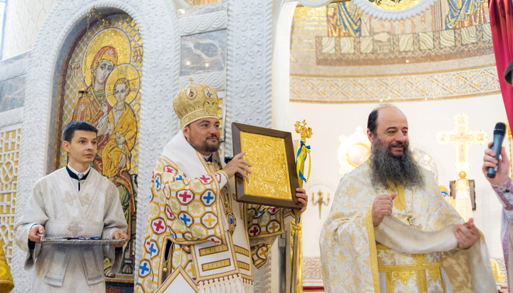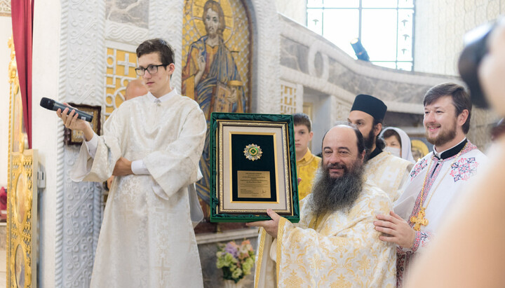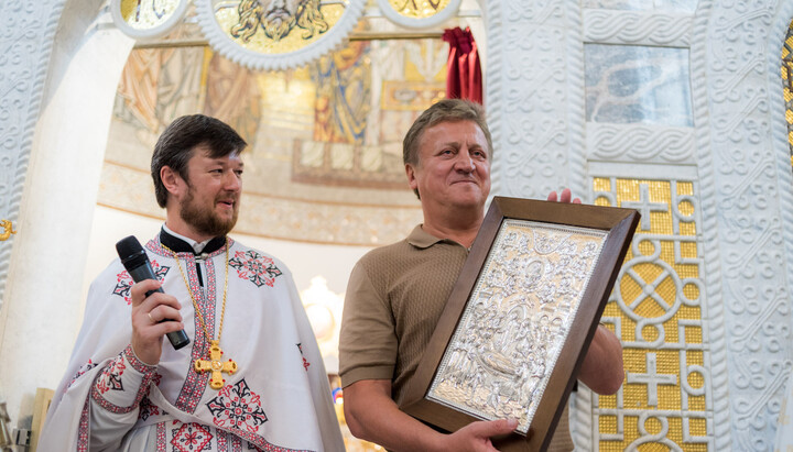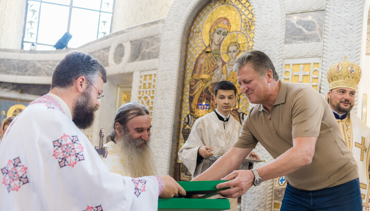Drabinko said that the monks of Athos visited Kyiv "with the blessing of Patriarch Bartholomew". The photo shows how he and the parish sponsor Igor Lysov present guests with valuable gifts.