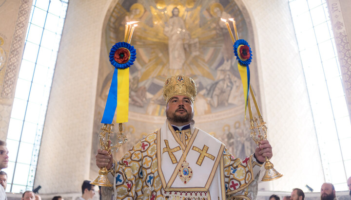 Monks from Mount Athos concelebrate with Drabinko in his cathedral in Kyiv