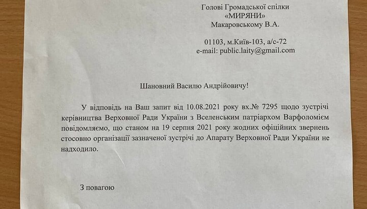 Both the Office of the President and the apparatus of the Verkhovna Rada replied that they did not have the information requested by the laity.