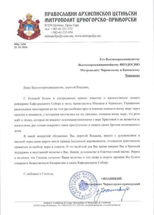 Metropolitan Joanikije of Montenegro and the Littoral sent a letter to Metropolitan Theodosiy of Cherkasy and Kaniv in connection with the seizure of the Archangel Michael Cathedral of the UOC in Cherkasy, reports the website of the Cherkasy Eparchy.