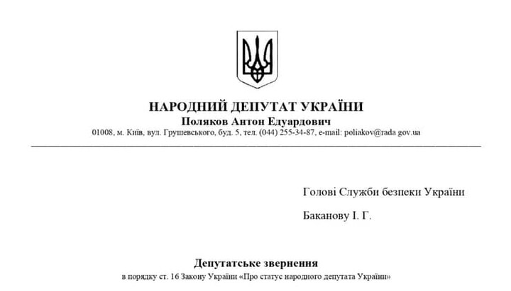 In a parliamentary inquiry, which Poliakov also published, he clarified the necessity to investigate "the facts of the financing by the BRSM-Nafta gas station network and its owner Andrei Biba against the arrival of the Ecumenical Patriarch, as well as the activities of the Russian Orthodox Church in Ukraine."