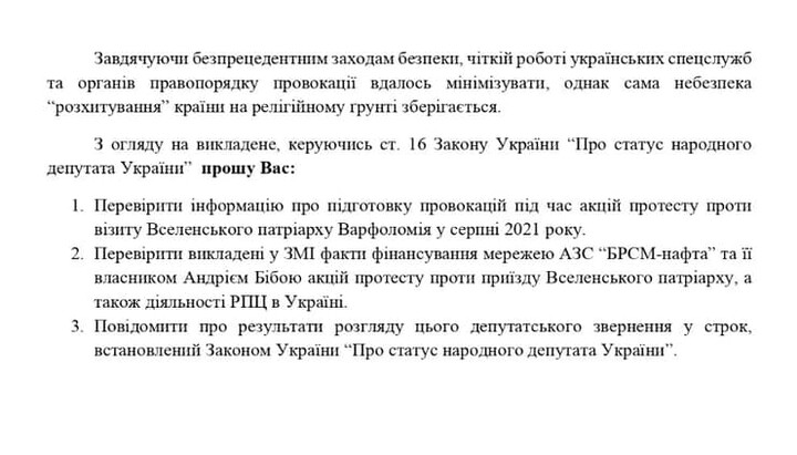 According to the deputy, law enforcement officers should investigate statements "on the preparation and conduct of provocations during protests against the visit of Ecumenical Patriarch Bartholomew", which were circulated in the media in August this year.