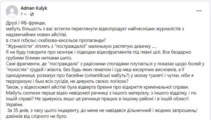 “Bishop” of the OCU, Adrian Kulik, on his Facebook page commented on the story of “Nadzvychayni Novyny” (“Breaking News”) of the ICTV channel, with the footage of him beating his neighbour with his fists.